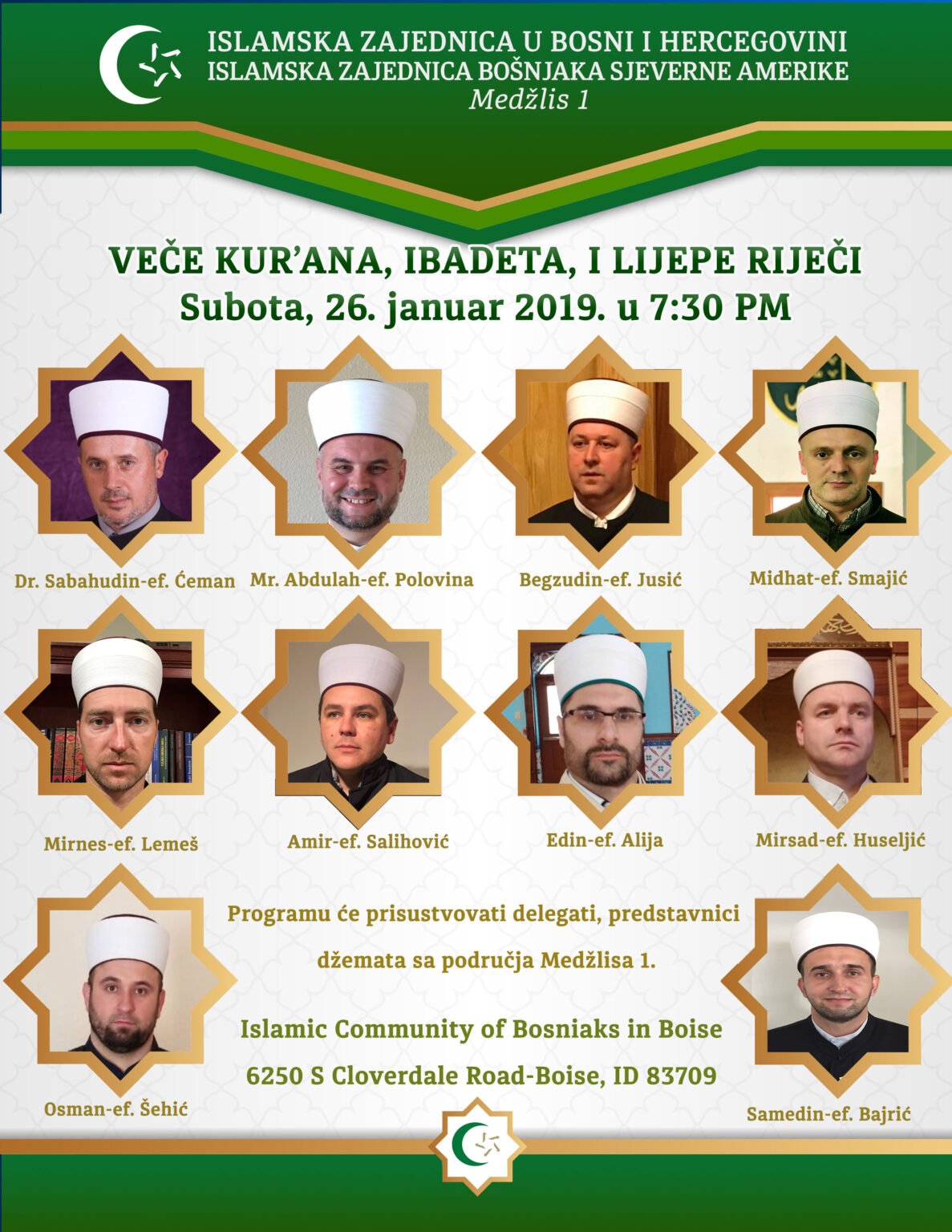 U subotu 26. januara 2019. godine, sa početkom u 7:30 p.m., održat će se Veče Kur’ana, ibadeta i lijepe riječi u džematu Boise, tačnije u Islamic Community of Bosniaks in Boise.