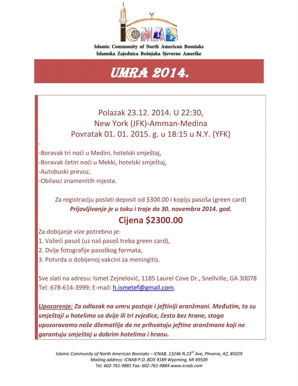 Islamska Zajednica Bošnjaka Sjeverne Amerike je dobila priliku da obezbjedi umru za sve naše džematlije krajem decembra mjeseca. Za više informacija pogledajte sledeću brošuru, i ako ste zainteresovani obratite se Ismet ef. Zejneloviću dok još ima slobodnih mjesta. Depozit, kopiju pasoša (green card) treba poslati Ismet ef na adresu u brošuri.